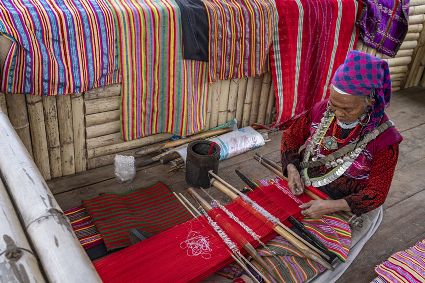 僜人俗稱“僜巴”,是一個(gè)生活在我國(guó)西藏邊境的族群,人口較少。僜人有自己獨(dú)特的語(yǔ)言,生活方式簡(jiǎn)樸,起居穿戴有自己的習(xí)俗。僜人織品色彩艷麗,主色為紅色、粉紅色,由于沒(méi)有圖紙,每位織娘僅憑記憶織出腦海中的花紋,所以每一幅織品都獨(dú)一無(wú)二。