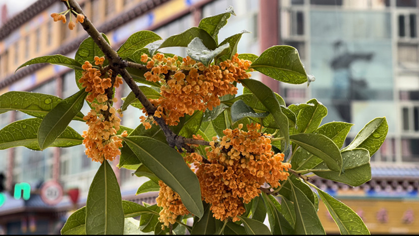 無間纏綿的秋雨后,漫步在巴塘的街道,悠悠的一股香氣沁入心扉。此時,頭頂?shù)乃{天,云卷云舒,嬌小的丹桂掛在樹梢枝頭輕輕搖曳,花香詩意相融于高原江南別有意趣。