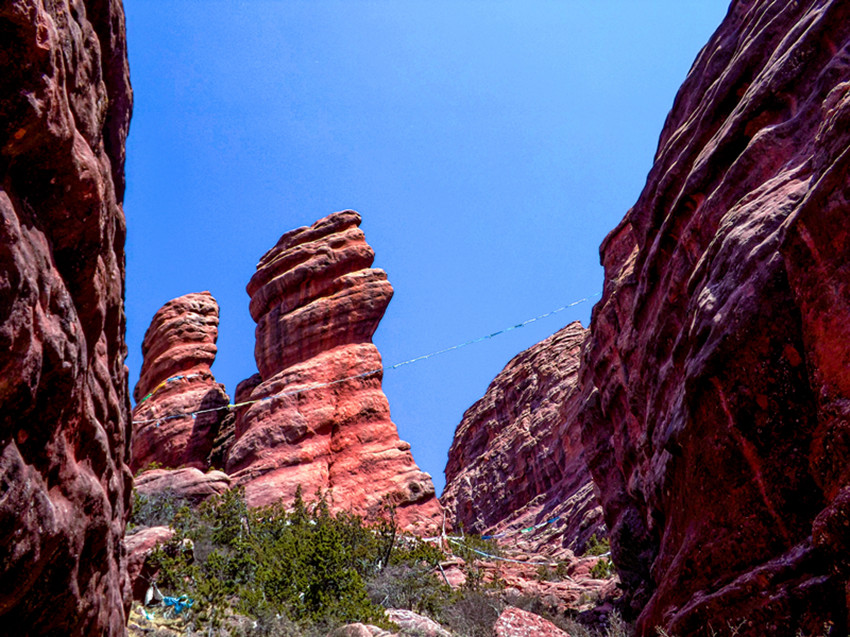 這套巖石較為粗糲,固結(jié)程度較差,抗風(fēng)化能力相對(duì)較弱,因而阿色丹霞很難見(jiàn)到陡峭的山崖、連綿的絕壁長(zhǎng)墻,這與廣東丹霞山“頂平、身陡、麓緩”的“丹霞標(biāo)準(zhǔn)像”截然不同。
