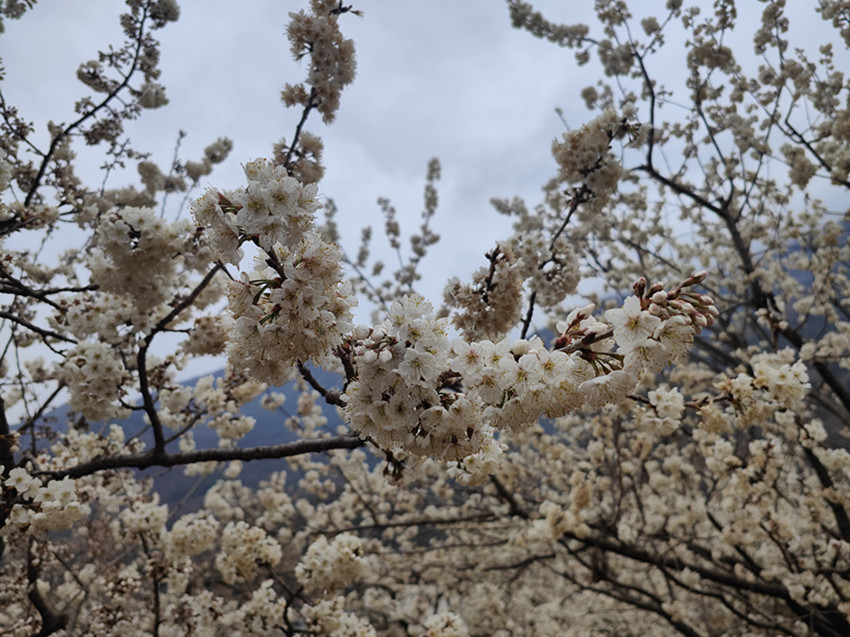 不同于油菜花的燦爛,瀘定縣冷磧鎮(zhèn)千畝櫻桃花,堆雪疊紗、滿山漫白,為整個(gè)山谷的金黃璀璨增添了一道恬謐的寧?kù)o。