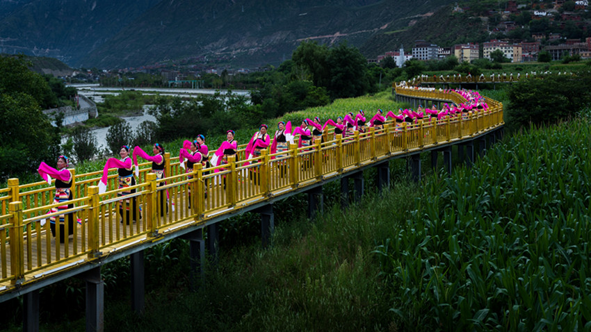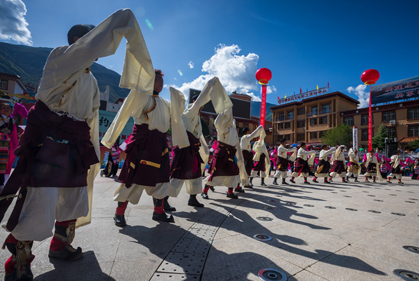 金弦子廣場(chǎng),舞者們仿若守護(hù)者一般,圍著金黃色的弦子雕塑,或輕歌曼舞或昂揚(yáng)踏步,斑斕的畢旺、搖曳的流蘇和飄逸的紅袖與花共舞,與景相映,聲聲吟唱、步步踏尋,是追憶更是誓言。