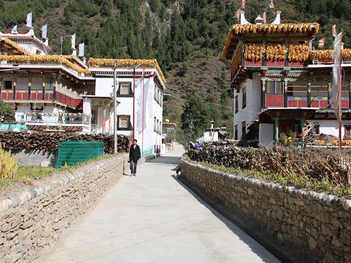 走進(jìn)冬日的丹巴縣革什扎鄉(xiāng)三道橋村,一幅如詩如畫的鄉(xiāng)村美景映入眼簾:一排排新穎別致而獨(dú)具嘉絨特色的白色藏房鑲嵌在彎彎的革什扎河旁,格外耀眼。一條條平直寬敞的硬化路像一根根潔白的哈達(dá)連接家家戶戶,寬敞平坦的公路上,轎車、農(nóng)用車、拖拉機(jī)穿梭來往,別具一格的村民活動中心紅旗迎風(fēng)飄揚(yáng)。 這是如今的三道橋民族團(tuán)結(jié)新村。