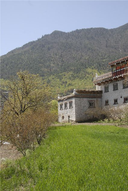 丹巴縣梭坡鄉(xiāng)為大渡河第一鄉(xiāng),大渡河由此匯集了丹巴縣境內(nèi)的大金河、小金河、東谷河、革什扎河,旖旎而去。四月,大渡河帶來充沛的雨量,在梭坡鄉(xiāng)兩岸高山之巔,綠色正在點染土地、房屋、人們的笑容以及湛藍(lán)的天空。
