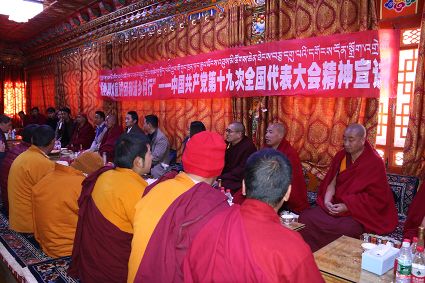 宣講團(tuán)成員勇勇用藏語(yǔ)激情洋溢的宣講黨的十九大精神,現(xiàn)場(chǎng)不斷響起熱烈的掌聲。當(dāng)勇勇講到我國(guó)五年來(lái)取得的輝煌成就時(shí),僧人們都激動(dòng)不已,紛紛為發(fā)展成就點(diǎn)贊?!奥犃私裉斓男v,我進(jìn)一步了解到了我們國(guó)家這些年來(lái)取得的發(fā)展成就。一直以來(lái),黨對(duì)我們的關(guān)懷是看得見摸得著的,現(xiàn)在我們的寺廟管理越來(lái)越規(guī)范,基礎(chǔ)設(shè)施也得到了完善,通往寺廟的道路也有了明顯改善,我們的生活越來(lái)越好了,這一切都是共產(chǎn)黨的功勞?!彼聫R僧人尺乃表達(dá)著對(duì)黨的感恩。