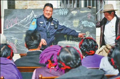 陽(yáng)春三月,康定市甲根壩鄉(xiāng)扎日村壩子里,村民們圍在黑板前,認(rèn)真聽(tīng)著民警巴桑呷瓦妙趣橫生、詼諧幽默的“授課”,時(shí)不時(shí)發(fā)出開(kāi)心的笑聲。