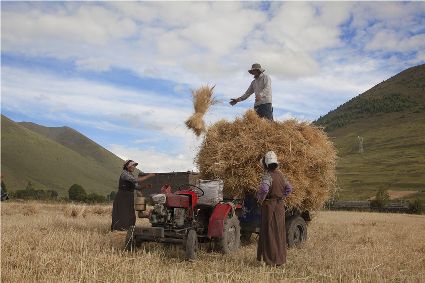 聯(lián)合收割機(jī)已在高原大地施展威力。那些平坦的大地里,拖拉機(jī)的穿梭,收割機(jī)的鳴唱,耳聞目睹,隨外可見(jiàn)。在山地間,大型機(jī)械無(wú)法進(jìn)入的地方,原始的勞作仍沒(méi)失去它本身的價(jià)值。“汗滴禾下土,粒粒皆辛苦”的場(chǎng)面仍然存在……農(nóng)人的歡歌喜語(yǔ)浸漫于天地間,豐收的喜悅早把辛勤的勞作沖淡。