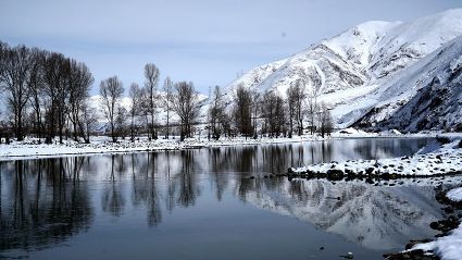 還留在枝頭上的綠色已被簇簇白雪點(diǎn)綴著,銀色的薄霧一重一重,遠(yuǎn)處雪峰皚皚,冰川閃爍、青山融融、波光粼粼。