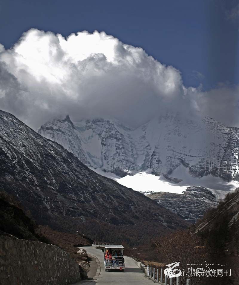 一輛電瓶車載著游客前往6032米的仙乃日雪山附近的觀景點。