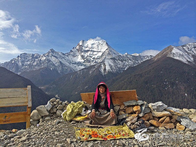 去往亞丁風景區(qū)的路上,一位藏族婦女在觀景臺邊擺著地攤賣當?shù)厥罪椇吞禺a(chǎn)。