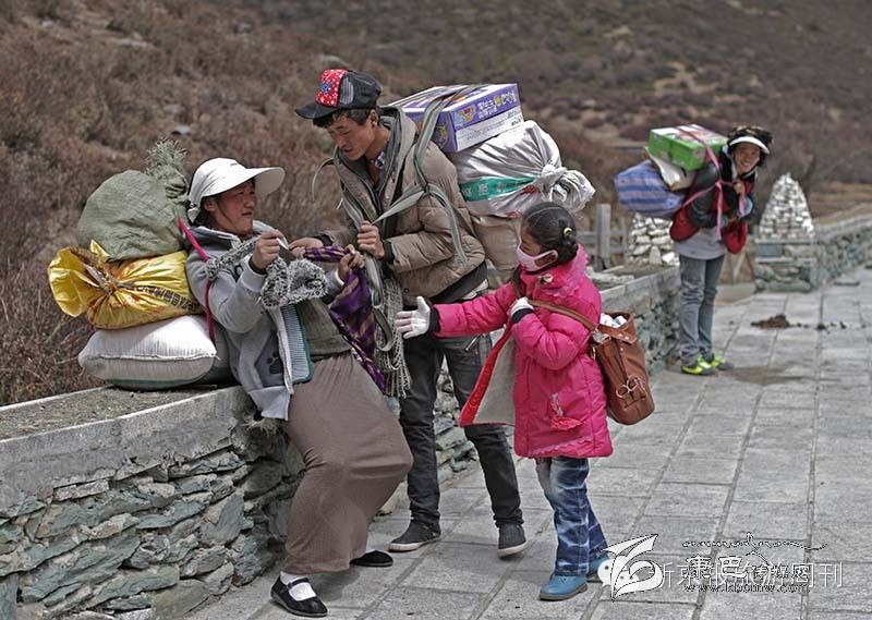 在海報4000多米的亞丁景區(qū),幾名當?shù)鼐用癖持剡_百余斤物品走五公里往牛奶河居住地。