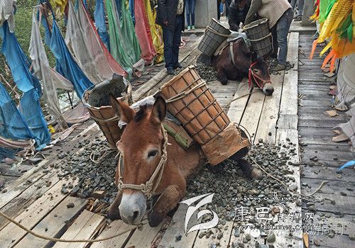 這是318和317國(guó)道都不通過(guò)的甘孜州白玉縣,從白玉縣城通往建設(shè)鄉(xiāng)德沙村的路是一條木制棧橋,2014年5月4日的中午,兩頭騾子在300斤石料的重壓下踩斷了中間的橋板,兩條前腿從踩碎的木板處懸著,騾子發(fā)出粗壯的喘息聲,無(wú)法掙扎,不能動(dòng)彈。棧橋上有路過(guò)的藏民,手中旋轉(zhuǎn)著轉(zhuǎn)經(jīng)筒,他口中念念有詞:騾子啊,你還沒(méi)有得到解脫。一群來(lái)自外地的游客都很驚詫。​ ​騾子運(yùn)輸隊(duì)的王玉海,在過(guò)往行人和同行的騾隊(duì)鄉(xiāng)親的幫助下,先卸下騾子身上背負(fù)的碎石,然后手伸到騾子前腿根處,用力抬起騾子的前身。在查看騾子沒(méi)有受傷后,王玉海把這兩只騾子牽到騾隊(duì)最后面,然后,引著另外5只負(fù)重的騾子,從橋靠左邊的雙層木板橋面上通過(guò),騾子隊(duì)受到驚嚇,不愿意上橋,王玉海安撫了一會(huì)兒騾子隊(duì)后,在同伴的協(xié)作下,前面牽引,后面驅(qū)趕,終于,王玉海的7只騾子過(guò)橋,其他8個(gè)同伴的50多頭負(fù)重的騾子也一一通過(guò)。