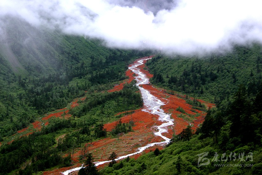 紅石灘位于海螺溝景區(qū)雅家埂兩河口地帶,落在山間尤其是溪水流經(jīng)之處的花崗巖,因其上附著一層紅色的藻類(lèi),故被稱(chēng)為紅石。
