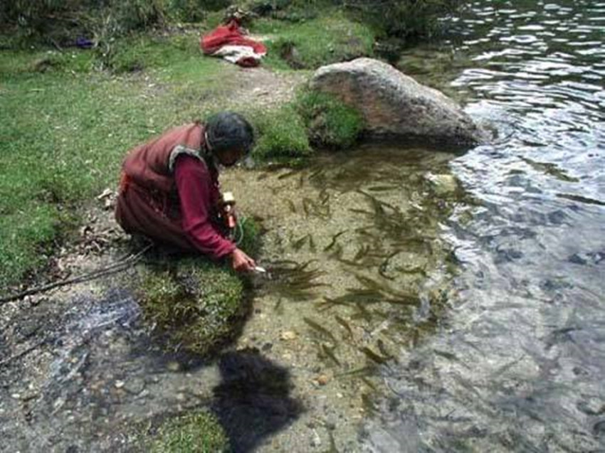 在湖邊的一塊平地上,有座被林莽掩映的廟宇,廟宇粉墻黛瓦,森嚴(yán)的大門銅環(huán)锃亮。棲息在原始森林中的藏馬雞與盤羊,跟寺院的喇嘛和尼姑建立了深厚的友情,相處得非常融洽。每年11月至來年5月,高山被茫茫大雪所覆蓋,大地披上了銀裝,這時(shí)候成群的動(dòng)物到低處覓食,寺院利用這個(gè)機(jī)會(huì),派人定時(shí)定點(diǎn)撒鹽巴和食物予以喂養(yǎng),漸漸使野生的動(dòng)物們不再怕穿紅色袈裟的人,到后來居然無所顧忌地進(jìn)入寺院覓食。