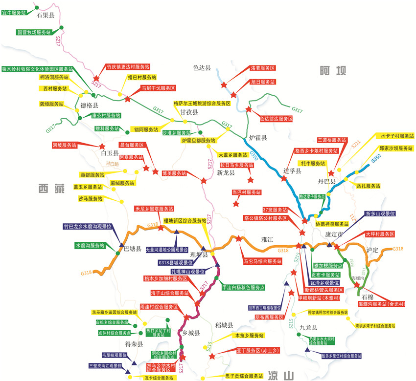 77個服務區(qū)(站、點)地處我州六條旅游線路和十條景觀大道。主要集中在:G318線(瀘定——康定——雅江——理塘——巴塘),G350線(丹巴——八美——道孚——爐霍——色達),S217線(理塘——稻城——香格里拉鎮(zhèn)——亞?。琒211線、S434線(瀘定——海螺溝——榆林)。