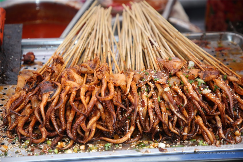 作為一個(gè)四川人,對(duì)于麻辣味的食物毫無(wú)抵抗力,在康定后街林立的商鋪中,記者一眼就相中了“深海魷魚(yú)花”這家店??粗褐t油的魷魚(yú)花靜靜地躺在紅椒和芹菜間,記者咽了咽口水,向老板買(mǎi)了一份兒?!罢媸羌兗兊拇ㄎ秲簺](méi)錯(cuò)了,又麻又辣的?!庇浾邔?duì)老板說(shuō)。老板回答到:“魷魚(yú)花最講究的就是刀法了,要切得好看。雖然在顧客看來(lái)都差不多樣子,但是我每次都要經(jīng)過(guò)細(xì)細(xì)斟酌再一刀一刀的切,爭(zhēng)取多弄幾種樣式,現(xiàn)在我的??蛡円矔?huì)細(xì)細(xì)地考究我切的魷魚(yú)花了。以前我只賣(mài)烤魷魚(yú),只是在家里偶爾會(huì)給我兒子做魷魚(yú)花,后來(lái)看我兒子喜歡吃,才開(kāi)始慢慢地賣(mài)魷魚(yú)花,沒(méi)想到還是很受歡迎。這次美食節(jié),我發(fā)現(xiàn)沒(méi)有人做魷魚(yú)花,所以我就帶著我兒子喜歡的魷魚(yú)花來(lái)參加這次美食節(jié)了?!崩习逍χ浾哒f(shuō)。