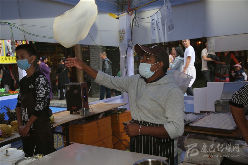 要說(shuō)美食節(jié)最炫酷的店鋪,那非“印度飛餅”莫屬了。記者穿過(guò)層層圍觀的人群,點(diǎn)了一份菠蘿飛餅。只見(jiàn)廚師將捏好的面團(tuán)在案板上揉了幾下,便捏緊面餅一端按順時(shí)針?lè)较蜣D(zhuǎn)動(dòng),手里的面餅越轉(zhuǎn)越大,越轉(zhuǎn)越薄,幾近透明,接著就是放餡料,稍做煎炸,切割裝盤(pán),短短一分鐘內(nèi),一氣呵成。記者接過(guò)盤(pán),咬下一口,“喀嚓”一聲,再一口就吃到了菠蘿的清香,外層淺黃松脆,內(nèi)層綿軟白皙,略帶甜味,好一個(gè)外脆內(nèi)嫩?。〗榔饋?lái)層次豐富,一軟一脆,口感對(duì)比強(qiáng)烈,嚼過(guò)之后,齒頰留芳。當(dāng)脆餅撞上菠蘿的清香,就像在夏天突然掉進(jìn)一個(gè)水池,清爽又驚喜。“感覺(jué)就是一件的藝術(shù)品啊!”如此的驚嘆聲從人群中迸發(fā)出來(lái)。