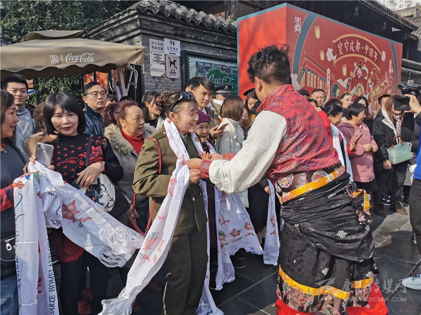 快閃還未開始,20名身著少數(shù)民族服裝的藏族姑娘小伙,便成為了一道最獨特、亮麗的風(fēng)景線。隨后,他們給游客們帶來了獨具甘孜特色的歌舞《康定情歌》《甘孜踢踏》,悠揚的歌聲、奔放的舞步,讓圣潔甘孜大美天成的獨特風(fēng)韻完美展顯,吸引了春熙路如潮的人群,被歌舞魅力感染,不少市民隨著他們一起唱跳了起來。而此時的成都寬窄巷子里,也正在演繹著一場震撼的“快閃”,四名穿著格薩爾王服飾的大將,身披鎧甲、手持刀劍,格外威武帥氣,市民和游客紛紛拿出手機拍照留念。“快閃”結(jié)束后,熱情的甘孜兒女為周邊的觀眾獻(xiàn)上潔白的哈達(dá),向他們致以美好的祝福,并誠摯歡迎他們到甘孜旅游。