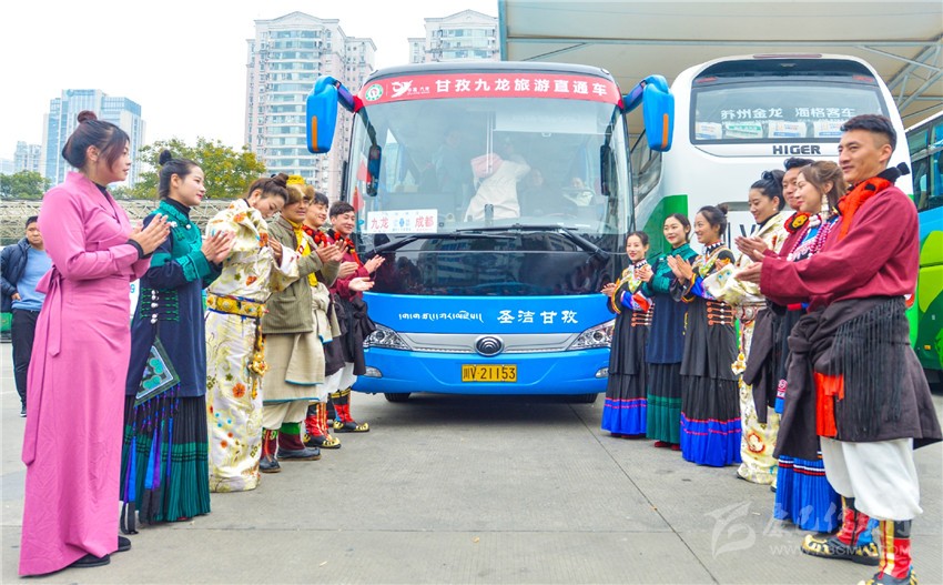 景區(qū)直通車(chē)授牌儀式和自駕游車(chē)隊(duì)授牌儀式也是本次推介會(huì)的亮點(diǎn)。兩項(xiàng)儀式旨在進(jìn)一步方便廣大游客到九龍旅游,并開(kāi)啟成都直通九龍旅游及運(yùn)輸融合發(fā)展的歷史征程。現(xiàn)場(chǎng),貼有“穿越藏彝走廊,體驗(yàn)民俗風(fēng)情”和“甘孜九龍旅游直通車(chē)”車(chē)標(biāo)的汽車(chē)引得不少人注目,有的還當(dāng)即向工作人員咨詢(xún)票價(jià)、路線。