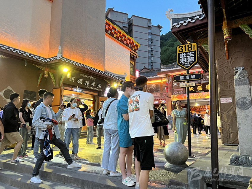 隨著夜幕降臨,在網(wǎng)絡(luò)上熱度不減的康定夜景逐漸展現(xiàn),游客們漫步折多河畔,感受避暑勝地帶來的涼爽。