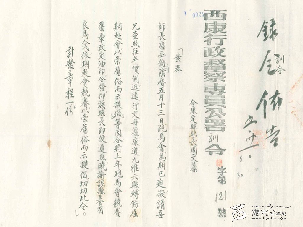 康定城各民族雜居,各種民族文化相融,形成了康定特有的民俗、風(fēng)俗。現(xiàn)在已經(jīng)不可能見(jiàn)到的“郭達(dá)將軍廟會(huì)”和每年“四月八轉(zhuǎn)山會(huì)”期間在康定城郊舉辦的“賽馬會(huì)”,這些屬于康定特有的民俗風(fēng)情,在民國(guó)時(shí)期曾經(jīng)盛況空前。舉辦“郭達(dá)將軍廟會(huì)”,警察要出來(lái)維持秩序。這份賽馬簡(jiǎn)章特指1940年“四月八轉(zhuǎn)山會(huì)”時(shí)的一次賽馬。據(jù)《甘孜州志》記載:在1940年的5月,由于有“康定、瀘定、九龍、丹巴、道孚、乾寧”騎手參加賽馬活動(dòng),才制定了這份“新簡(jiǎn)章”。