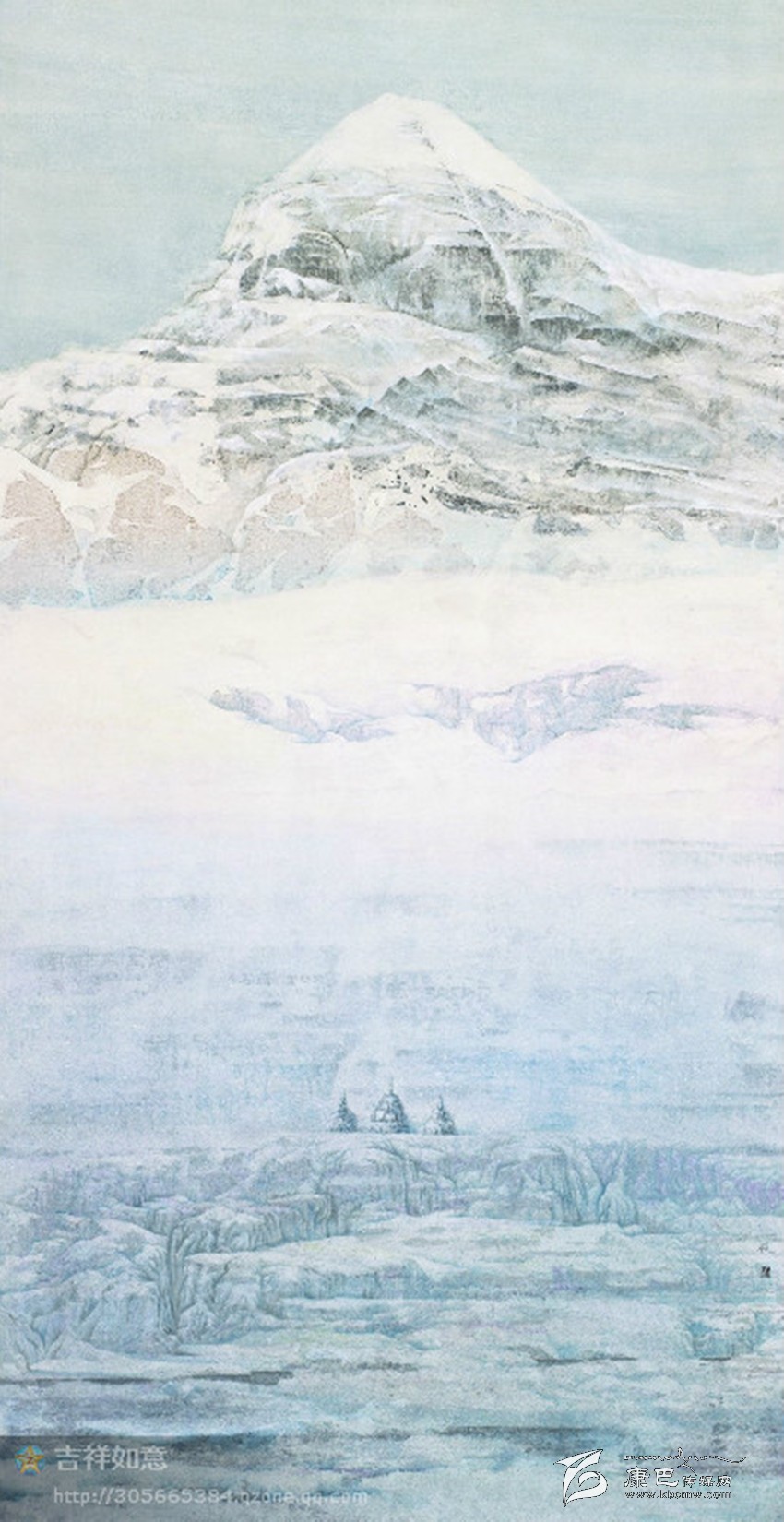 最后創(chuàng)作出了這張作品:神圣的岡仁波齊,您是世界中心;巍巍頂上是幾千年來,帝釋天的居所;山下積雪皚皚,在滿是瑪尼的巖壁下,是象征佛、法、僧的三座石塔,又宛如你忠實(shí)的信徒正在對你娓娓述說、虔誠祈禱。時(shí)間的河流,正在您腳下寂靜、流逝、封凍。