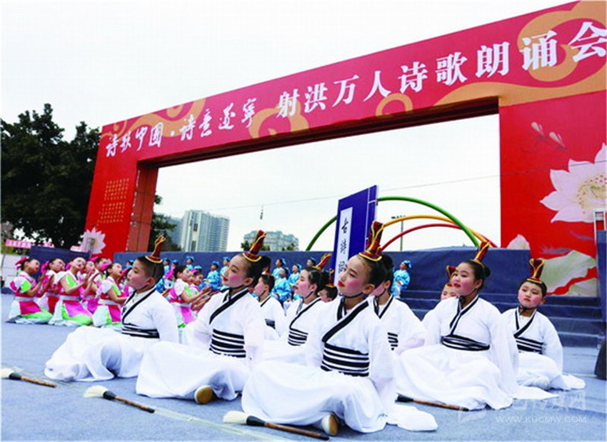 據(jù)了解,本次活動是《詩刊》2016年度陳子昂詩歌獎系列活動之一,參與人數(shù)之多、規(guī)模之大,在射洪縣尚屬首次。現(xiàn)場由射洪中小學生和企事業(yè)單位組成的方陣和演出隊伍,以載歌載舞或配樂詩朗誦等形式登臺表演, 內(nèi)容以經(jīng)典詩詞為主,也有圍繞當前中心工作而創(chuàng)作的新詩。這是文化的傳承,更是血脈的延續(xù)。參加詩歌朗誦會的最小的4歲,或許他們不懂文字背后的美,并不理解字里行間透露出的人生況味,但他們在射洪這樣的文學滋 養(yǎng)中出生、成長。