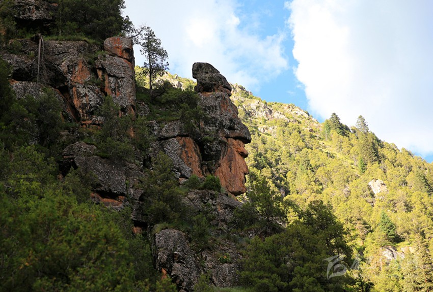 當(dāng)?shù)厝朔Q其為扎朵菊,又叫阿尼嘿塞神山。從河谷右側(cè)向上約2000米左右的半山腰就是格薩爾王自生石像所在地,此處山形奇特,整個(gè)山體大部分由巖石構(gòu)成,懸崖峭壁,人根本無(wú)法攀越,記者在現(xiàn)場(chǎng)認(rèn)真反復(fù)觀察石像未有任何人工痕跡,完全是自然天成。石像坐西向東,整體由巖石構(gòu)成,約50米高,周圍灌木叢生。在距格薩爾王自生像不遠(yuǎn)的最高處,還發(fā)現(xiàn)了一處珠牡王妃坐式巨型山巖。在陽(yáng)光的照射下,逆光的剪影效果令她的發(fā)髻、臉部和體形都呈現(xiàn)得惟妙惟肖。神態(tài)極像昂首靜坐的尊貴王妃,目視著格薩爾王。大自然的鬼斧神工在一個(gè)山體上造就了格薩爾王和珠牡王妃兩個(gè)自生石像,這樣的奇跡也許是冥冥中注定的一種巧遇,真實(shí)的出現(xiàn)在多爾家溝,并被鏡頭捕捉下來(lái)呈現(xiàn)給世人。
