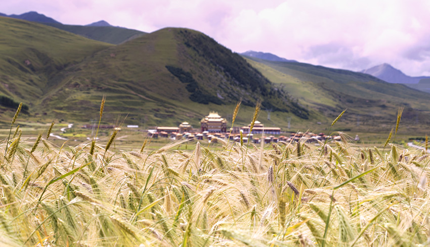 甘孜縣地處橫斷山脈的東北邊緣,康北地區(qū)腹心地帶,雅礱江從這里緩緩流過,肥沃的土壤和無垠的土地總會(huì)配上澄徹晴朗的天空。一顆顆飽滿金黃的青稞常在風(fēng)里搖晃著秋天,“康北糧倉(cāng)”的美在這時(shí)展現(xiàn)得淋漓盡致。