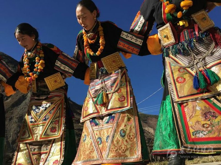 蒙自鍋莊服飾獨特,屬東義服飾類。稻城東義女式服飾感覺與鄉(xiāng)城瘋裝有些相似,融合了納西族女裝和稻城土裝的元素,一是折疊多、折疊數是固定的,內折和外折各54個,左右胸襟分別以紅黃綠黑等顏色的料子鑲拼而成,分別代表財富、福壽、牲畜、先知、土地。男式服裝比較簡便,突出之處就是系在腰間的彩帶。