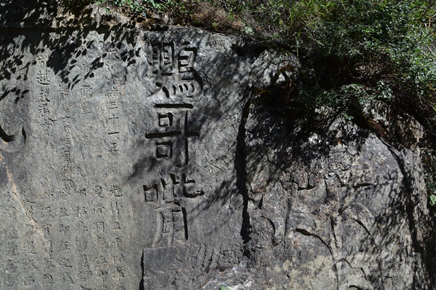 《竺國通衢》刻在一顆大石頭的下部,石高約三米,長約六米,刻于清道光年間,意為通向印度的通道,充分說明這條道路的價值和作用。大石和字已藏在核桃樹下,勢大必難除,加之雨水侵蝕下已風(fēng)化嚴(yán)重。