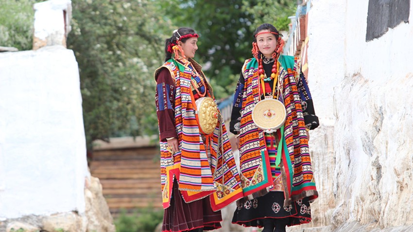 在鄉(xiāng)城可見到盛唐年間遺落的痕跡。至今,這里的藏族姑娘、婦女還穿著文成公主進(jìn)藏時的“瘋裝”,整個服飾五顏六色,絢麗至極。裙子上有108個褶。這種服飾在今天的阿里地區(qū)仍有,但其他藏區(qū)就極為罕見了。