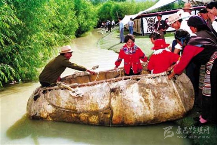 牛皮船,顧名思義是牛皮做的船,做牛皮船的材料很簡單,只用木料和牛皮。木頭要選用韌性較好的樹木做骨架,把泡軟、牛毛基本褪凈的4張牦牛皮縫起來,并將濕牛皮包在木骨架上繃好,用牛皮繩子捆緊、曬干、擦油定型,再把牛皮縫口接頭處擦抹大量牛、羊油以便將接縫密封,避免進(jìn)水,再配上一對劃槳,就可以下水使用了,一只牛皮船只需一個船夫。