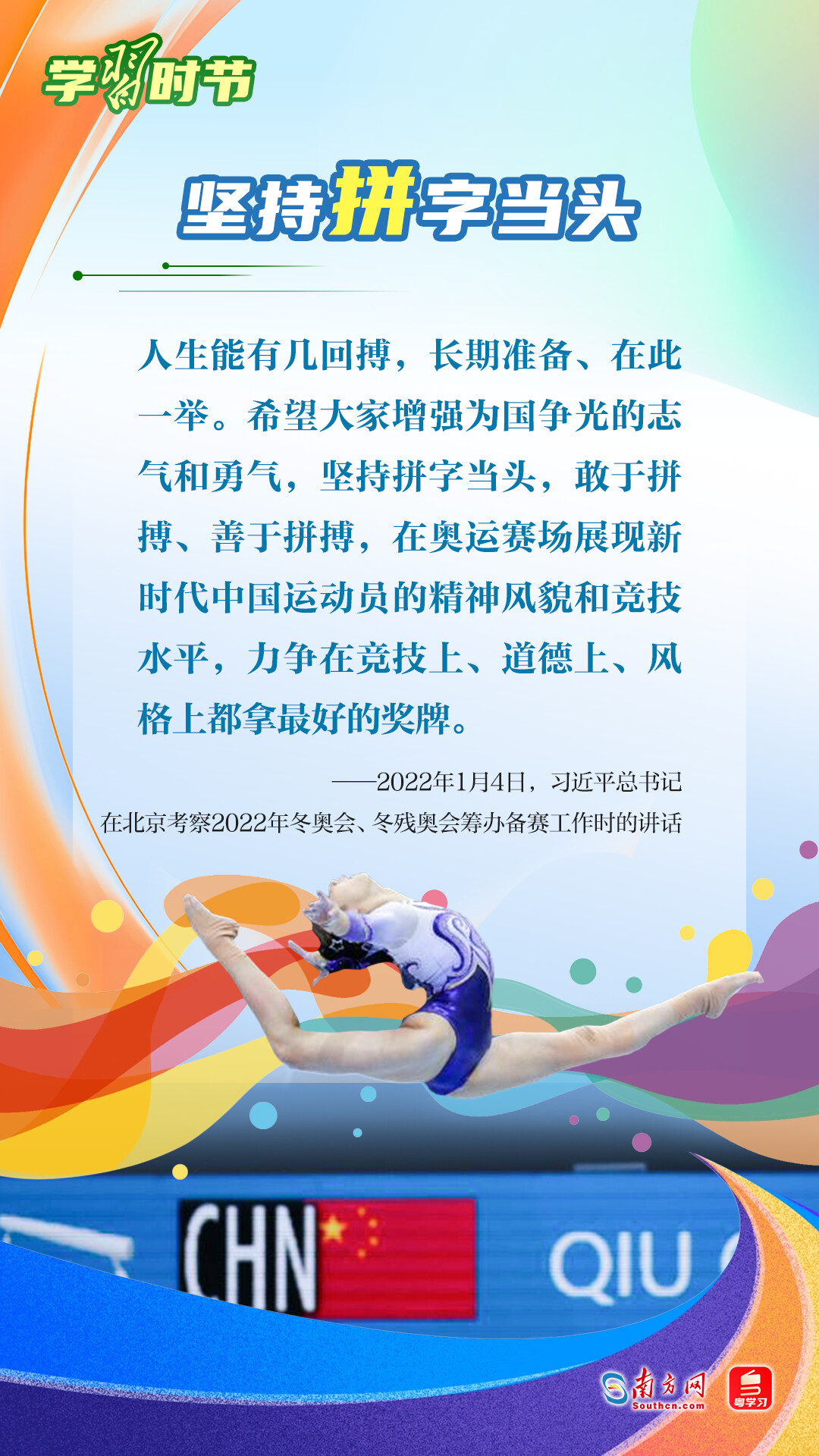 “我們不以勝負(fù)論英雄,同時(shí)英雄就要敢于爭(zhēng)先、敢于爭(zhēng)第一?!绷?xí)近平總書記曾在不同場(chǎng)合論述奧林匹克精神,深刻闡明了勝與負(fù)、成與敗的辯證關(guān)系,對(duì)奧林匹克“更快、更高、更強(qiáng)——更團(tuán)結(jié)”的格言進(jìn)行詮釋。讓我們一同學(xué)習(xí)習(xí)近平總書記對(duì)奧林匹克精神的重要論述,心懷夢(mèng)想、奮勇拼搏,攜手走向美好明天。