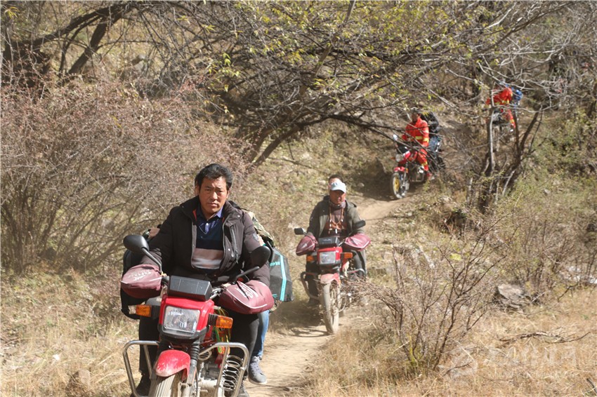 11月4日,澤仁頓珠在中轉(zhuǎn)站接到第一個(gè)任務(wù)——送一名搶險(xiǎn)隊(duì)員和約50公斤的物資到堰塞體上。從則巴村出發(fā)鉆進(jìn)灌木叢中,他才感受到路途艱難。所謂的道路是之前的人和摩托車踩出來的“騾馬道”,最窄的地方僅約30厘米。張牙舞爪的灌木枝不時(shí)從臉上、手臂上劃過,路兩邊不是陡坡,就是十幾米高的懸崖。