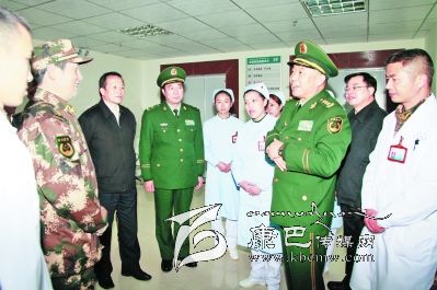 他還走進(jìn)每一個(gè)科室,檢查工作,與醫(yī)務(wù)人員交談,走進(jìn)病房,看望慰問正在這里接受治療的部隊(duì)官兵。