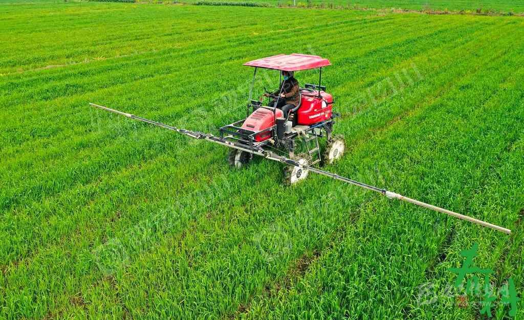 成都市青白江區(qū)彌牟鎮(zhèn)的智農農機專業(yè)合作社,工人正操作自走式噴桿噴霧機在麥田里打藥。