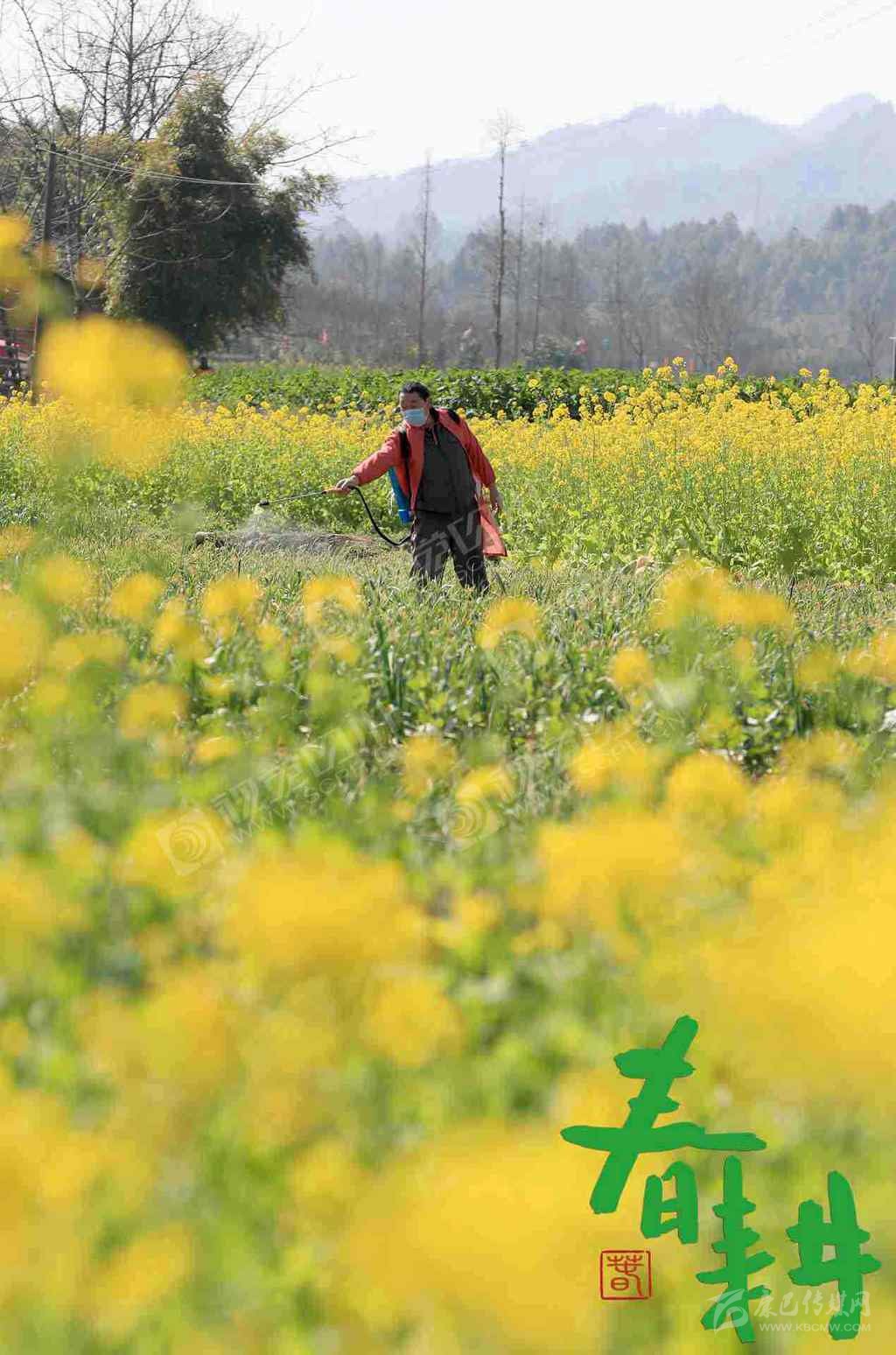 閬中市江南街道辦事處鐘山村,工人在給油菜噴灑農藥。