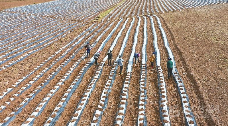 圖為在越西縣新民鎮(zhèn)大寨村,村民正在點種經(jīng)濟作物烤煙。
