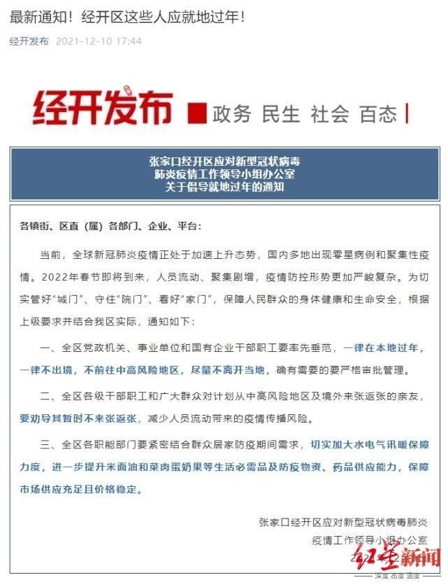 12月9日,河北張家口經(jīng)開區(qū)也發(fā)出通知:全區(qū)黨政機(jī)關(guān)職工等就地過年。通知中倡導(dǎo):全區(qū)黨政機(jī)關(guān)、事業(yè)單位和國有企業(yè)干部職工要率先垂范,一律在本地過年,一律不出境,不前往中高風(fēng)險(xiǎn)地區(qū),盡量不離開當(dāng)?shù)?,確有需要的要嚴(yán)格審批管理。