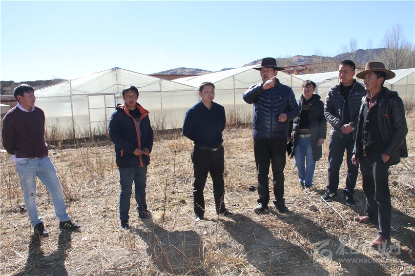理塘縣委副書記、縣政府縣長鄭顯峰(左四)調(diào)研產(chǎn)業(yè)扶貧。
