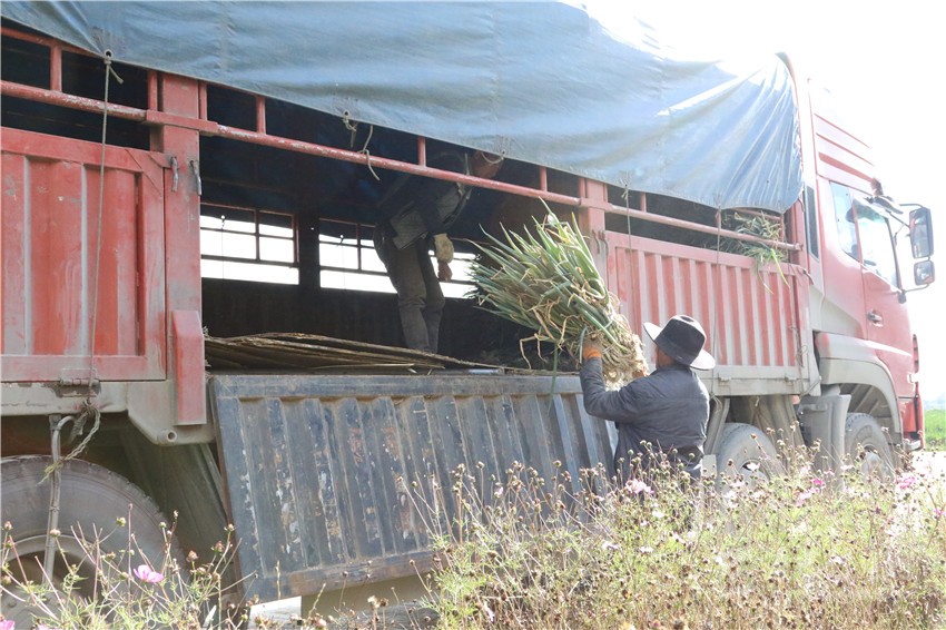 筆者看到,充翁格美熟練地先用鏟子從田地的側(cè)面挖下去2寸深,將大蔥拔出來撣去根須的泥土,然后將斷根的、中等的、大的大蔥分別堆放,每15斤左右打捆,每10捆過稱后搬運裝車。據(jù)他介紹,現(xiàn)在基地的大蔥每周要裝兩次車,每次裝10噸。