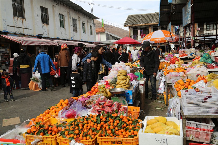新都鎮(zhèn)格色村的丹真大哥和老伴兒其吉牽著8歲的孫子正在干果店里挑選各類干果,身后的背簍里水果、蔬菜、酥油、牛肉等農(nóng)畜產(chǎn)品以及中國(guó)結(jié)、年畫(huà)、對(duì)聯(lián)、掛圖等吉祥的節(jié)日物品應(yīng)有盡有。
