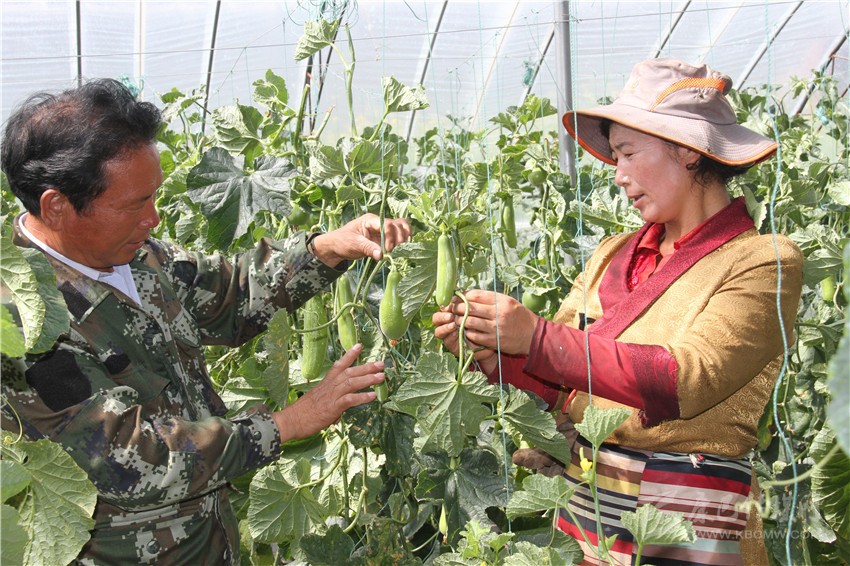 去年以來(lái),理塘縣通過(guò)引進(jìn)瑪吉阿米現(xiàn)代農(nóng)業(yè)有限公司、康藏陽(yáng)光農(nóng)牧業(yè)科技開(kāi)發(fā)有限公司,建立“支部+公司+合作社+農(nóng)戶”的管理模式,讓建檔立卡貧困戶直接受益,100余人實(shí)現(xiàn)在家門(mén)口打工、學(xué)技術(shù)。圖為8月6日,理塘縣甲洼鎮(zhèn)俄曲村貧困藏族農(nóng)戶一邊打工掙錢(qián),一邊跟公司聘請(qǐng)的技術(shù)員學(xué)習(xí)蔬菜種植技術(shù)。