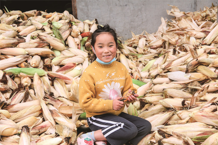 玉米堆成金黃色的小山,小孩們開心體驗著秋收帶來的喜悅。