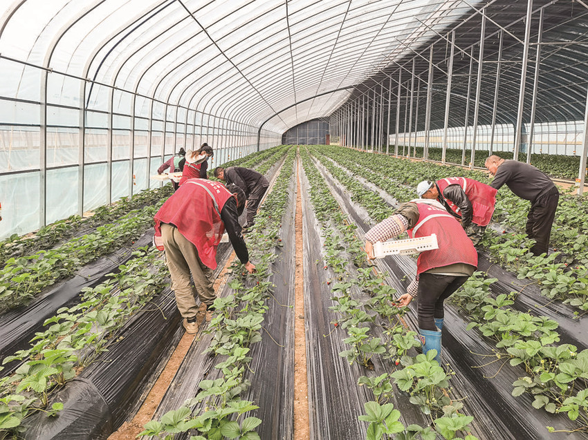 村民在大棚采摘草莓。