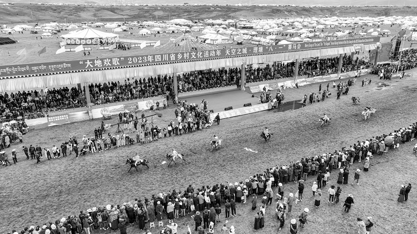 “中國藏族賽馬文化之鄉(xiāng)”“理塘八一傳統(tǒng)賽馬會”是四川涉藏州縣規(guī)模最大的賽馬會,賽馬傳統(tǒng)延續(xù)長達400余年?!霸缇吐犝f過馬背上的理塘,今天終于親眼所見,實在不虛此行。草原追風,策馬飛奔,蹄聲如雷,震徹山野,這是多么壯美的理塘萬馬奔騰圖啊!多想遠離城市的喧囂,策馬揚鞭,馳騁草原,豪邁瀟灑,勇往直前。以后每一年的理塘賽馬活動,我一定會帶上家人再來這里,因為理塘,可謂是心靈棲息的地方?!痹凇按蟮貧g歌”2023年四川省鄉(xiāng)村文化活動年——天空之城·理塘“八·一”賽馬會上,來自北京的游客石磊被當?shù)刭愸R文化吸引,和朋友玩得不亦樂乎。