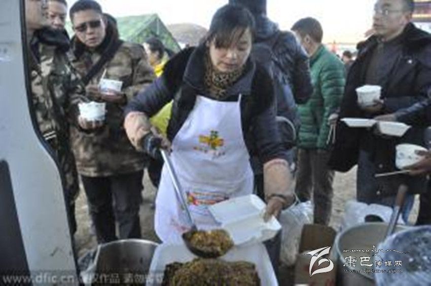 據(jù)了解,韓大哥是這家飯店的老板之一,他是仁壽縣人,幾年前和朋友來到新都橋開始經(jīng)營飯店??刀?.3級(jí)地震發(fā)生時(shí),他人在成都。但看到災(zāi)情發(fā)生,韓大哥立即和飯店另外幾個(gè)合伙人決定到安置點(diǎn)免費(fèi)送盒飯,“我在當(dāng)?shù)刈隽?、7年生意,現(xiàn)在出了事情,就應(yīng)該伸手支援嘛!”據(jù)韓大哥介紹,此次地震發(fā)生后,新都橋80%左右的飯店都已經(jīng)關(guān)門,他們的飯店因?yàn)檫€有一些接待工作,仍在正常營業(yè)。自11月23日晚上,他家的飯店就主動(dòng)為塔公鎮(zhèn)的安置點(diǎn)免費(fèi)派送盒飯,“包括中午和晚上兩頓,兩葷兩素一湯的配置。”因?yàn)樘Γ №n大哥來不及仔細(xì)統(tǒng)計(jì),他大概知道每天送出的盒飯?jiān)?200盒到1500盒之間,每天送出盒飯的成本在4、5千左右。但在他看來,這些其實(shí)都算不上什么,“能為災(zāi)區(qū)出一份力,我們就很滿足了,我們打算一直送到抗震救災(zāi)工作結(jié)束,也就是直到災(zāi)民有條件自己做飯的時(shí)候。”“這邊天氣很冷,他們吃的一般是些面包、牛奶之類的干糧,我們就是想讓大家吃到熱飯、熱菜。”據(jù)韓大哥介紹,每天飯店都會(huì)派出3、4個(gè)人將盒飯運(yùn)送到安置點(diǎn),“只要有人需要我們都會(huì)分發(fā)盒飯,包括一些志愿者和武警官兵也吃我們的飯。