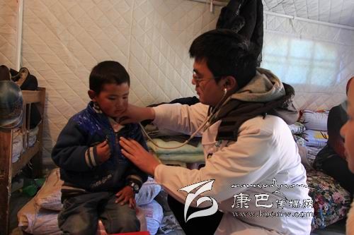 在新都橋鎮(zhèn)東俄洛三村的一頂救災(zāi)帳篷里,來(lái)自“雅安市抗震救災(zāi)醫(yī)療救援小組石棉分隊(duì)”的石棉縣人民醫(yī)院內(nèi)科醫(yī)生李登豐正在給當(dāng)?shù)貎和恋嵌嗉獧z查身體。土登多吉的母親說孩子這兩天感冒了,經(jīng)過檢查,李登豐發(fā)現(xiàn)土登多吉并未發(fā)燒,只是扁桃體有點(diǎn)發(fā)炎,于是趕緊讓同行的護(hù)理人員拿來(lái)了治療感冒和消炎的藥物。