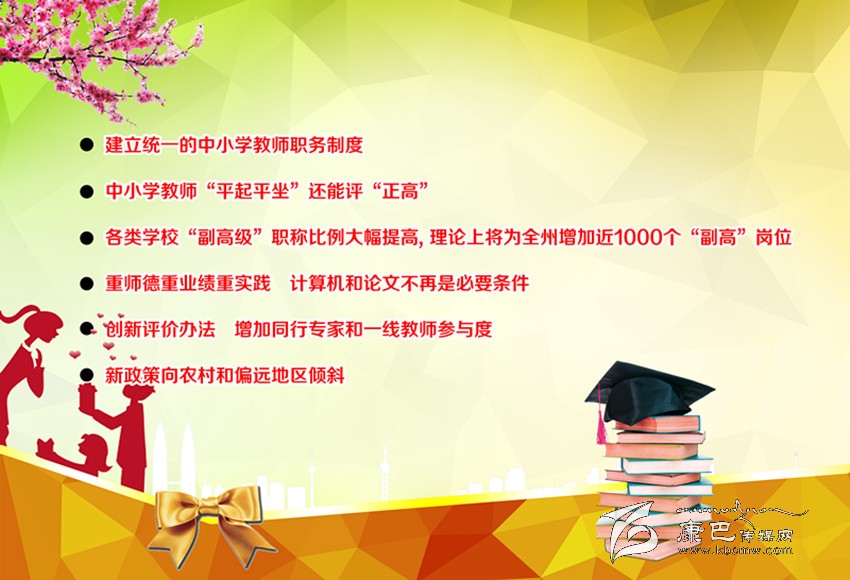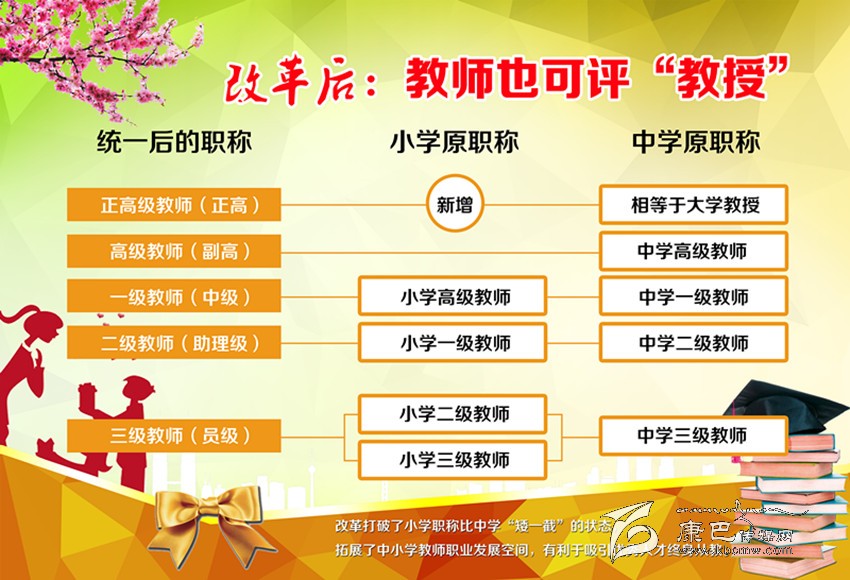 一是中小學(xué)教師職稱(chēng)“天花板”被拆除,可參與全省統(tǒng)一組織的“正高級(jí)”職務(wù)評(píng)定;評(píng)定后,工資、福利待遇與大學(xué)正教授等同。此項(xiàng)在此次改革中最受關(guān)注。