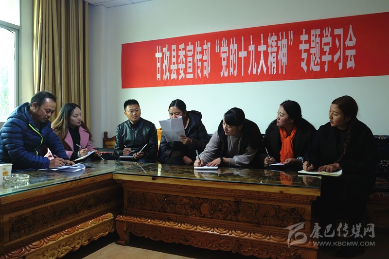 本網(wǎng)訊  (則瑪拉姆 文/圖)連日來,甘孜縣依托中心組、干部講堂、“三級三講”等學(xué)教平臺,圍繞“黨的十九大精神、《中國共產(chǎn)黨章程(修正案)》、習(xí)近平新時代中國特色社會主義思想、決勝全面建成小康社會”四大專題開展學(xué)習(xí),采取專家輔導(dǎo)講、專題研討學(xué)、集中考學(xué)評等形式,迅速組織廣大黨員干部原原本本學(xué)、聯(lián)系實際學(xué)、突出重點學(xué),切實把黨的十九大精神轉(zhuǎn)化為謀劃發(fā)展的思路、促進(jìn)發(fā)展的舉措、領(lǐng)導(dǎo)發(fā)展的能力和推進(jìn)發(fā)展的合力。圖為116日下午,縣委宣傳部組織全體職工專題學(xué)習(xí)黨的十九大精神。